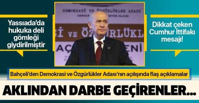 MHP Genel Başkanı Devlet Bahçeli, Demokrasi ve Özgürlükler Adası'nın açılış töreninde "Yassıada'da hukuka deli gömleği giydirilmiştir" ifadelerini kullandı