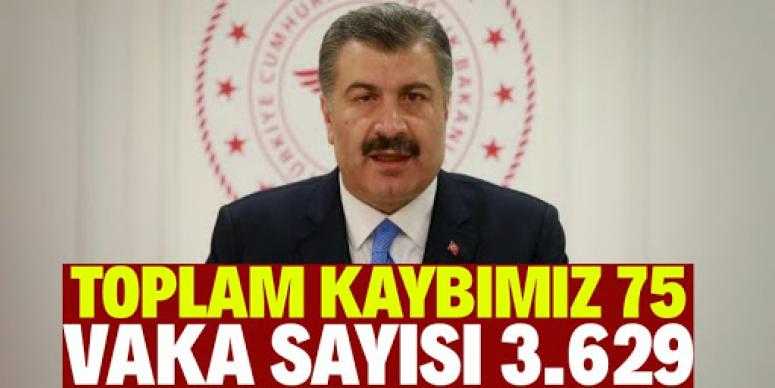 Sağlık Bakanı Fahrettin Koca, koronavirüste son durumu açıkladı. Koca, sosyal medyadan yaptığı paylaşımda ''Test sayımız dün 5.035’ti. BUGÜN 7.286 olarak gerçekleşti. 1.196 yeni tanı kondu. Hastalar ve temas çevreleri izole edildi. 16 hastamızı kaybettik. Bu sonuçlarla can kaybımız 75’e, hasta sayımız 3.629’a ulaştı. Sizi ısrarla tedbirleri uygulamaya davet ediyorum'' açıklamasını yaptı.
