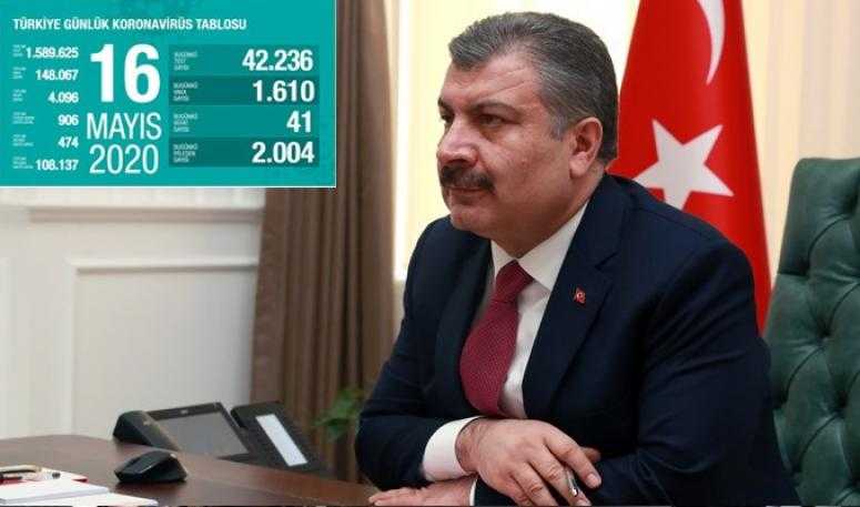 Bugünkü toplam test sayısının 42.236 , vaka sayısının ise 1.610 olduğunu belirten Bakan Koca, 41 kişinin hayatını kaybettiğini bugünkü iyileşen sayısının 2004 olduğunu ve toplam vefat sayısının 4 bin 96'ya yükseldiğini açıkladı.