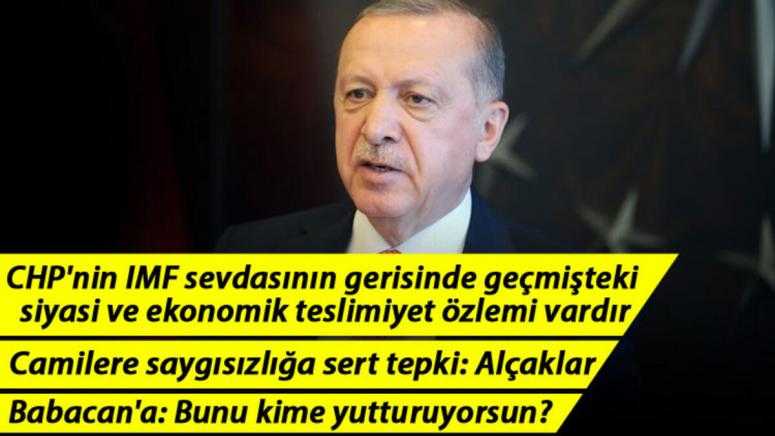 CHP'nin IMF sevdasının gerisinde ise Türkiye'yi geçmişteki siyasi ve ekonomik teslimiyet özlemi vardır. İktidara geldiğimizde IMF'ye 23,5 milyar dolar borç vardı. Sevgili vatandaşlarım, bu bunu 2013 Mayıs'a kadar ödedik ve o defteri kapattık. IMF Başkanına 'Siz bize siyasi noktada rol biçemezsiniz.' dedim. Bunu şuan bir parti kurmuş zat da bilir. Bu görüşmeyi Davos'ta yaptık. 'Siz sadece gelirsiniz borç-alacak ilişkilerimizi incelersiniz, bize siyasi rol biçemezsiniz.' dedim. Eğer dürüstse, ahlâklıysa bunu kendisinin de itiraf etmesi gerekir. Ama onlar IMF'e böyle bir ifade kullanamazlar. Böyle bir duruş sergileyemezler. Şuanda bile biz IMF ile irtibatlarımızı sürdürmemiz gerekiyor, borç almamız gerek diyorlar. IMF'nin bizden 5 milyar dolar istediğini kendisi çok iyi bilir. Biz güçlü olmasaydık onlar bizden bu borcu istemezdi. Ben kendisine 'Verin, bizden bugün borç alan yarın bizden talimat alır.' dedim. Yalan konuşmazlarsa bunu itiraf ederler. Ama edemezler.