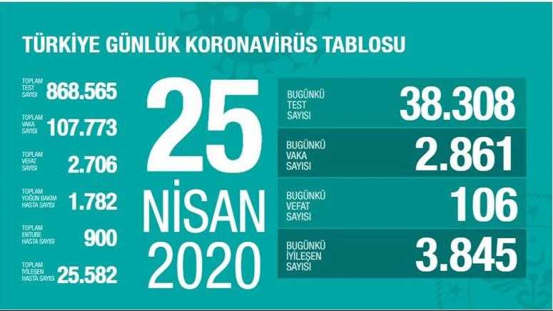 Bakan Fahrettin Koca, Türkiye'de korona virüs ile ilgili son dakika gelişmelerini paylaştı. Bakan Koca'nın paylaştığı son verilere göre Türkiye'de koronavirüsten hayatını kaybedenlerin sayısı 2 bin 706'ya yükseldi. 25 Nisan 2020 tarihinde koronavirüsten 106 vatandaş daha hayatını kaybetti.