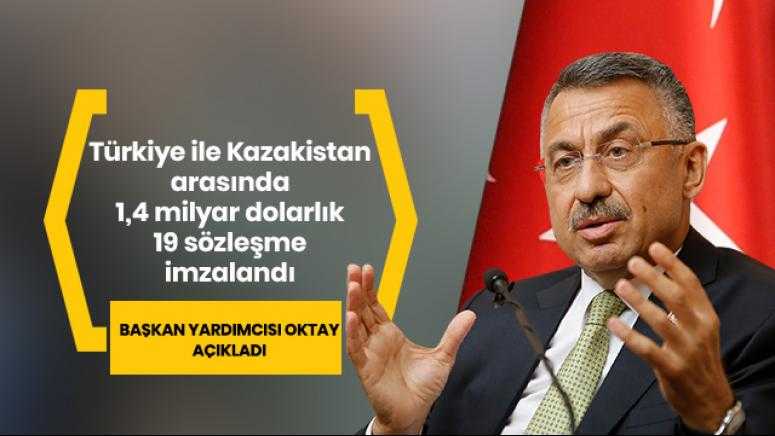 Cumhurbaşkanı Yardımcısı Fuat Oktay, Cumhurbaşkanlığı Dolmabahçe Çalışma Ofisi'nde gerçekleştirilen Türkiye-Kazakistan Hükumetlerarası Karma Ekonomik Komisyonu (KEK) 11. Dönem Toplantısı Protokolü imza töreninde konuştu. Cumhurbaşkanı Yardımcısı Oktay, Türkiye ile Kazakistan arasında 1,4 milyar dolar tutarında iş hacmi oluşturacak 19 sözleşme imzalandığını açıkladı.