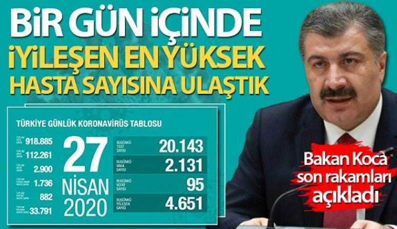 Türkiye'de son 24 saatte 95 kişi hayatını kaybetti, 2 bin 131 yeni tanı kondu, 4 bin 651 kişi de iyileşti Sağlık Bakanı Fahrettin Koca, Türkiye'deki yeni tip korona virüs (Kovid-19) salgınına ilişkin son verileri Twitter hesabı üzerinden paylaştı.